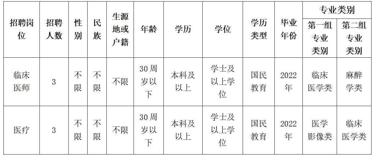 高等院校醫(yī)學(xué)類本科及以上學(xué)歷畢業(yè)后直接參加國家計劃內(nèi)住院醫(yī)師規(guī)范化培訓(xùn),2022年國家住院醫(yī)師規(guī)范化培訓(xùn)合格且具有國家執(zhí)業(yè)醫(yī)師資格,參加醫(yī)療衛(wèi)生行業(yè)招聘醫(yī)學(xué)類崗位的,視為2022年度應(yīng)屆畢業(yè)生(資格復(fù)審時須提供成績單、合格證明,否則取消聘用資格)。
