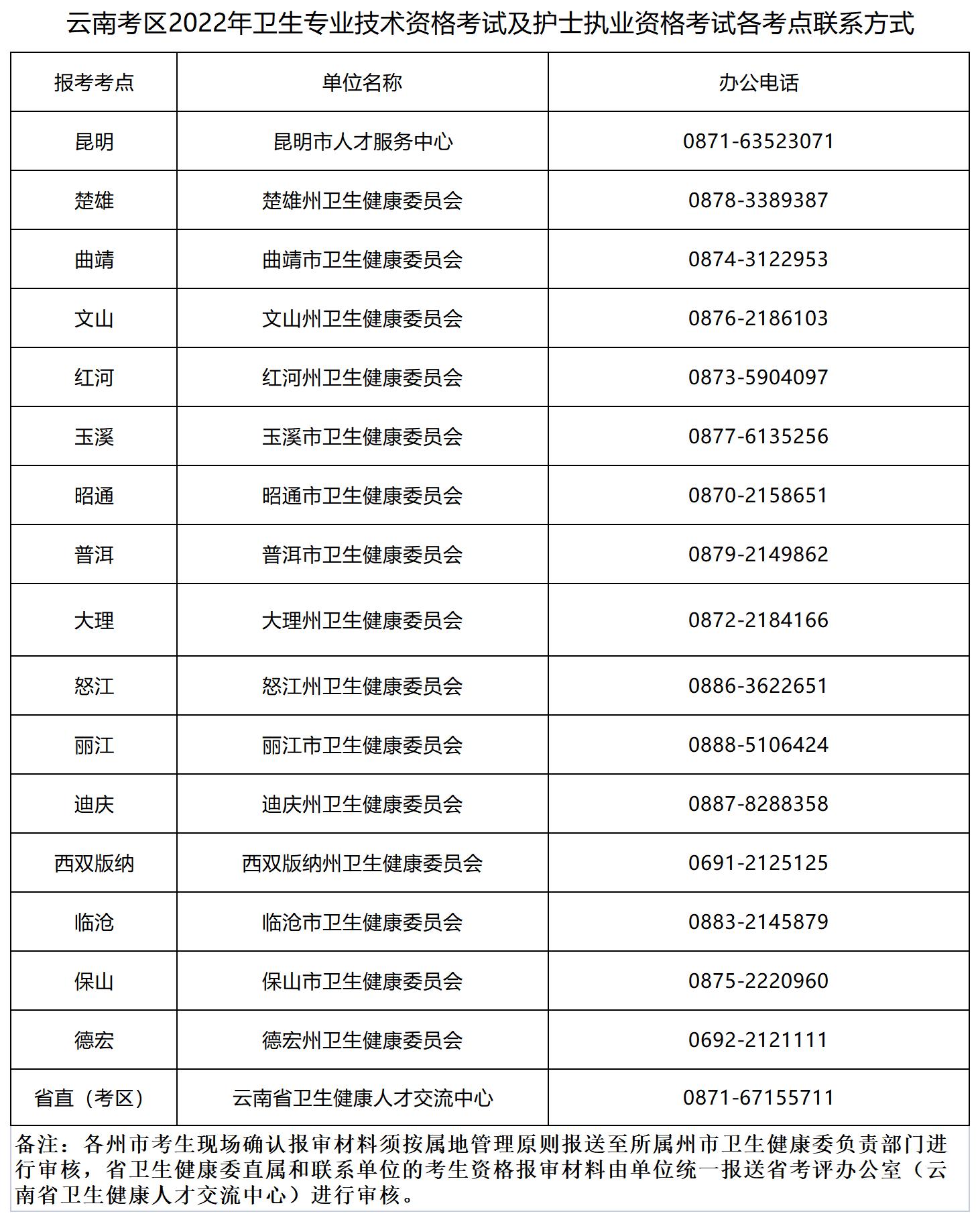 云南考區(qū)2022年衛(wèi)生專業(yè)技術(shù)資格考試及護(hù)士執(zhí)業(yè)資格考試各考點(diǎn)聯(lián)系方式