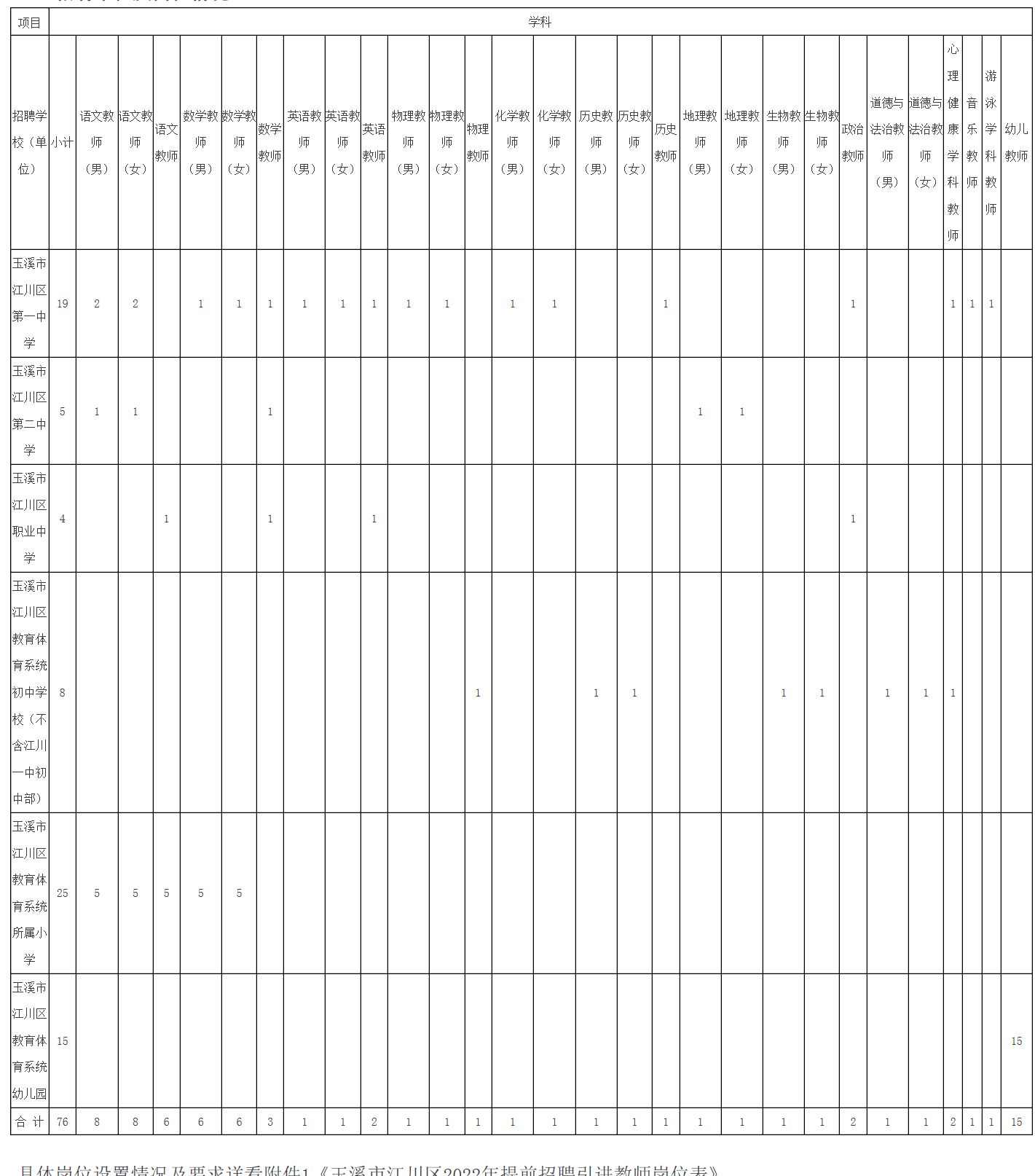 具體崗位設(shè)置情況及要求詳看附件1《玉溪市江川區(qū)2022年提前招聘引進(jìn)教師崗位表》。