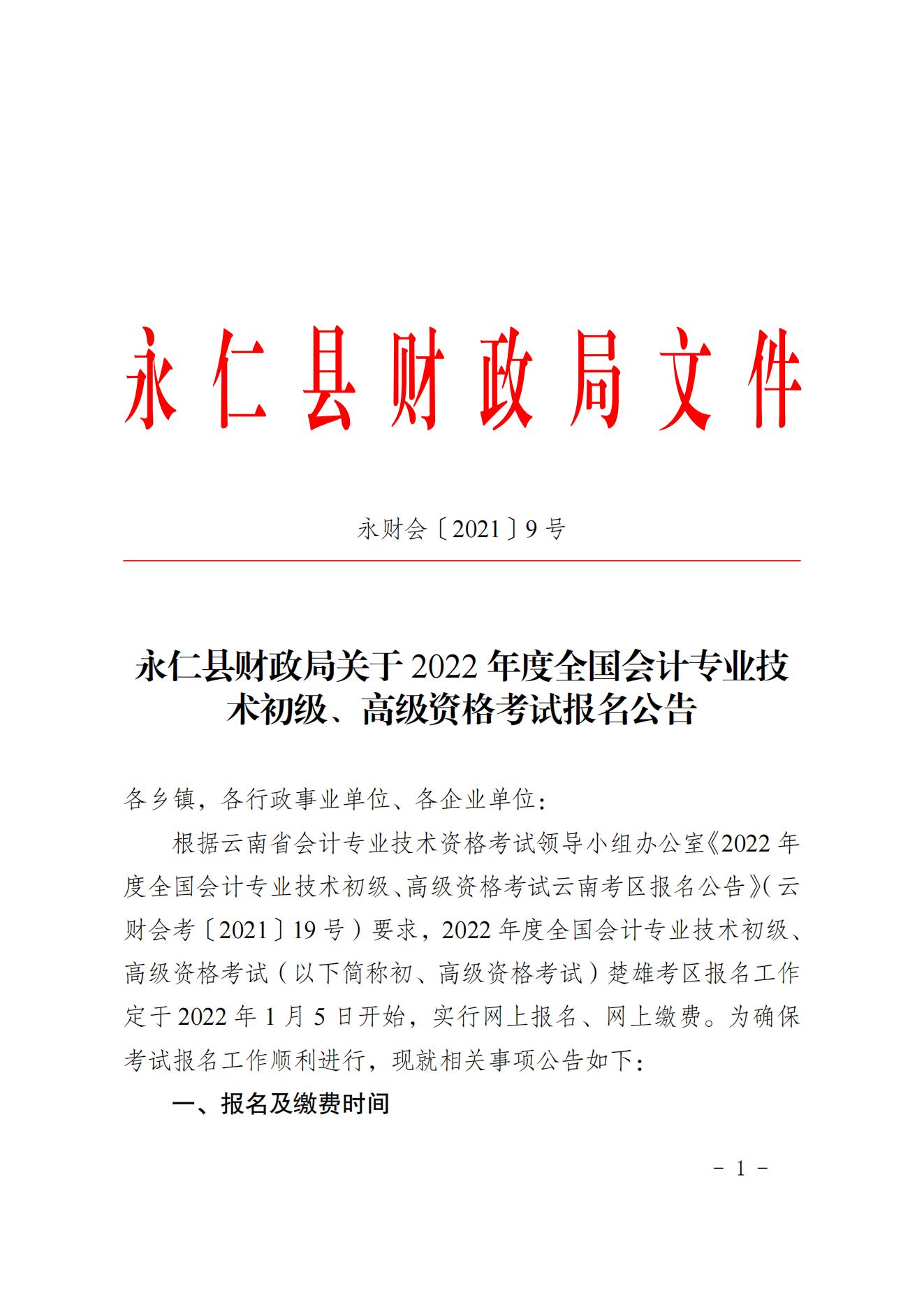 永仁縣財(cái)政局關(guān)于2022年度全國(guó)會(huì)計(jì)專業(yè)技術(shù)初級(jí)、高級(jí)資格考試報(bào)名公告