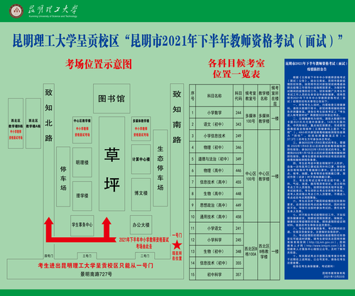 昆明市本次面試分2天進(jìn)行,共設(shè)置4個(gè)考點(diǎn)。各考生面試考點(diǎn)及具體進(jìn)入候考室時(shí)間詳見《準(zhǔn)考證》。由于考點(diǎn)較大及疫情防控需要等原因,請(qǐng)各位考生按準(zhǔn)考證上“考生進(jìn)入候考室時(shí)間”至少提前30分鐘到達(dá)面試考點(diǎn)。因時(shí)間、地點(diǎn)錯(cuò)誤或材料提交不全的考生,一律不得參加面試。面試考點(diǎn)為: