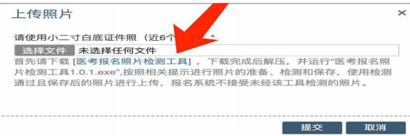 考生在網報系統(tǒng)上傳個人小二寸白底證件照時,應按照系統(tǒng)提示內容下載并運行“醫(yī)考報名照片檢測工具”,網報系統(tǒng)只接受經該工具檢測通過且保存后的照片進行上傳。