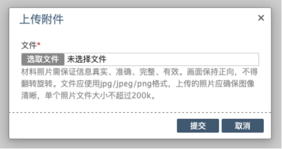 材料照片需保證信息真實、準確、完整、有效。畫面保持正向,不得翻轉旋轉。文件應使用jpg/jpeg/png格式,上傳的照片應確保圖像清晰,單個照片文件大小不超過200k。
