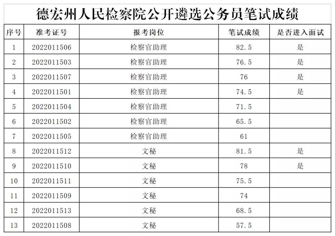 根據(jù)《德宏州人民檢察院2021年公開遴選公務(wù)員公告》,現(xiàn)將筆試成績及面試人員公布如下: