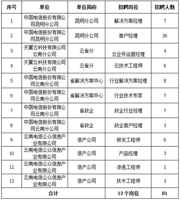 中國電信股份有限公司云南分公司行業(yè)專家及技術(shù)專家招聘81人