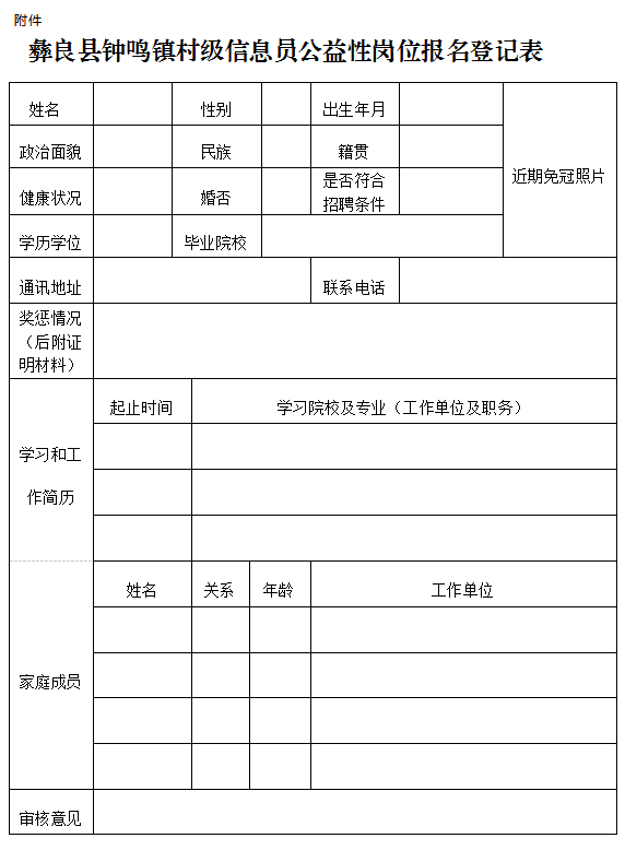 附件:彝良縣鐘鳴鎮(zhèn)村級信息員公益性崗位報名表
