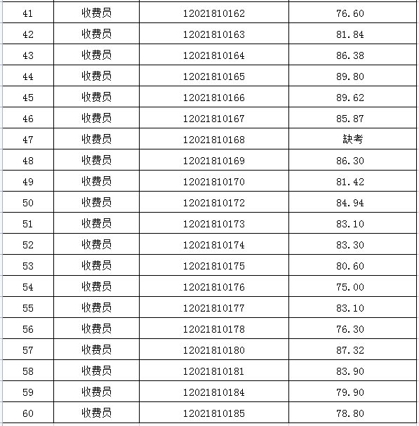 一、收費(fèi)員崗位面試成績(jī)