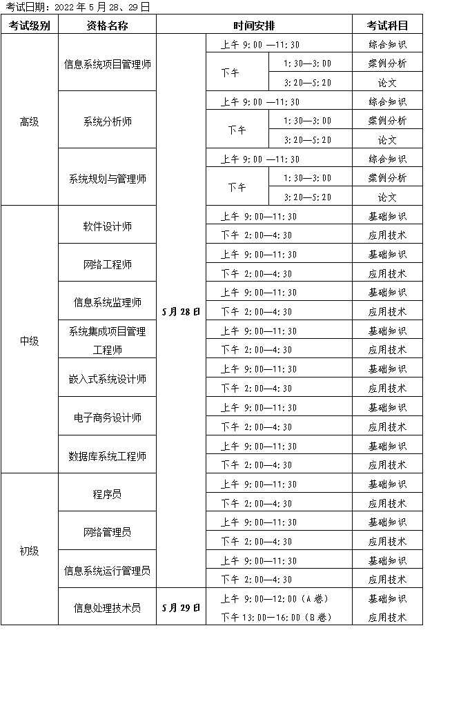 2022年上半年全國計(jì)算機(jī)技術(shù)與軟件專業(yè)技術(shù)資格(水平)考試時間安排(附表一)
