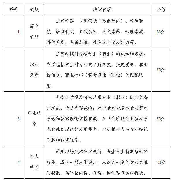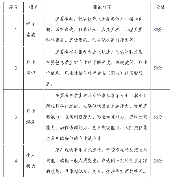 職業(yè)適應性測試包括綜合素質(zhì)面試、專業(yè)適應性測試兩個方面,滿分200分,考試時長:職業(yè)適應性測試面試時間為平均每名考生為6-10分鐘。