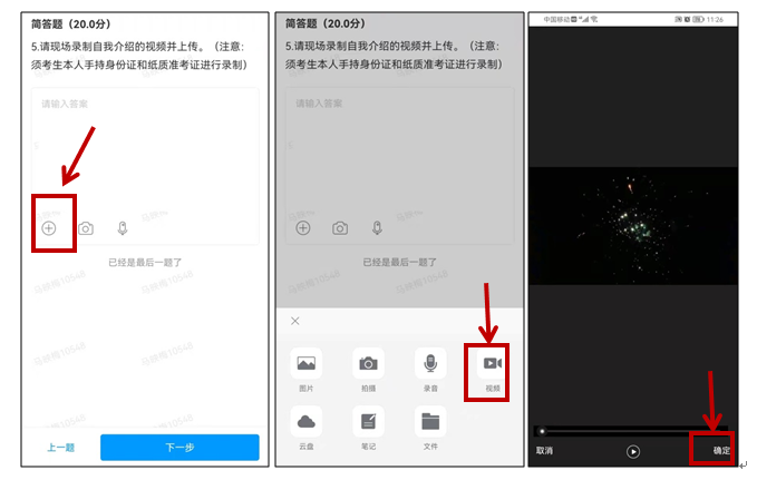 視頻上傳的操作為:點擊下方圖片中所示答案框下方的加號“+”,點擊視頻按鈕,選擇你剛剛錄制好的視頻,點擊確定,就可以上傳視頻。上傳完成的視頻將自動生成附件顯示在答案框內(nèi),即完成視頻錄制與上傳。