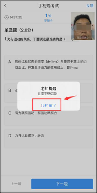 (五)考試在接收到監(jiān)控老師提醒后,需點擊“我知道了”,方可繼續(xù)答題。
