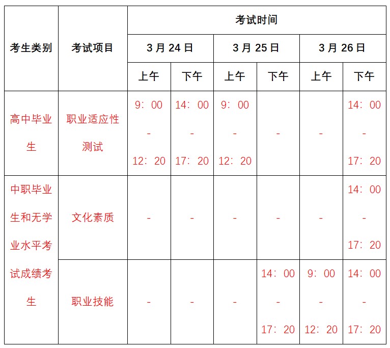 3、網(wǎng)絡(luò)遠(yuǎn)程測(cè)試考試時(shí)間:2022年3月24日~3月26日(具體時(shí)段以準(zhǔn)考證為準(zhǔn)),詳細(xì)考試流程見后續(xù)學(xué)校招生公告和《2022年云南省高職(???院校單獨(dú)招生考試考生須知》附件1,考試時(shí)間安排如下: