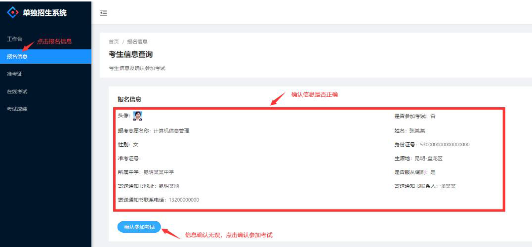 不點擊“確認參加考試”的考生,不能參加我校的單獨招生考試。