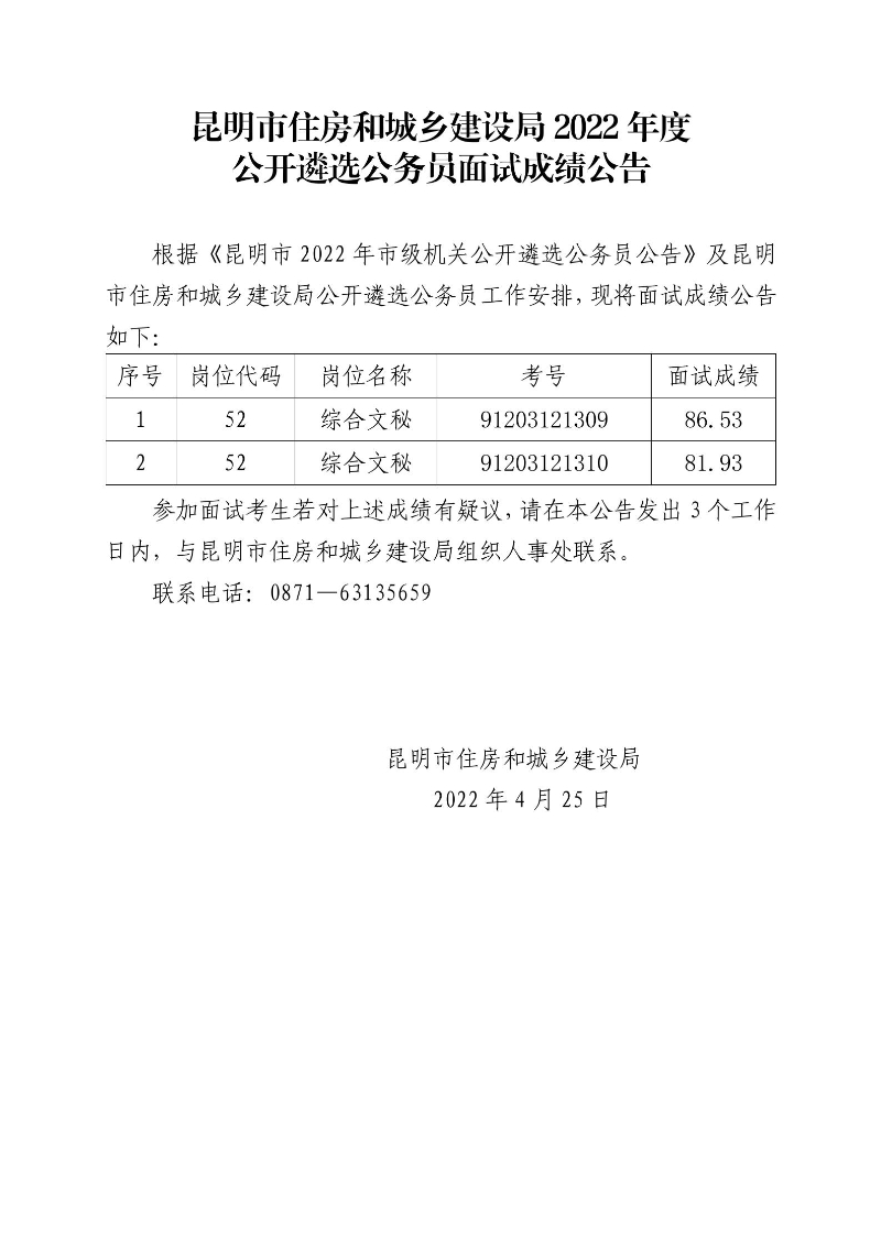 昆明市住房和城鄉(xiāng)建設(shè)局2022年度公開遴選公務(wù)員面試成績公告