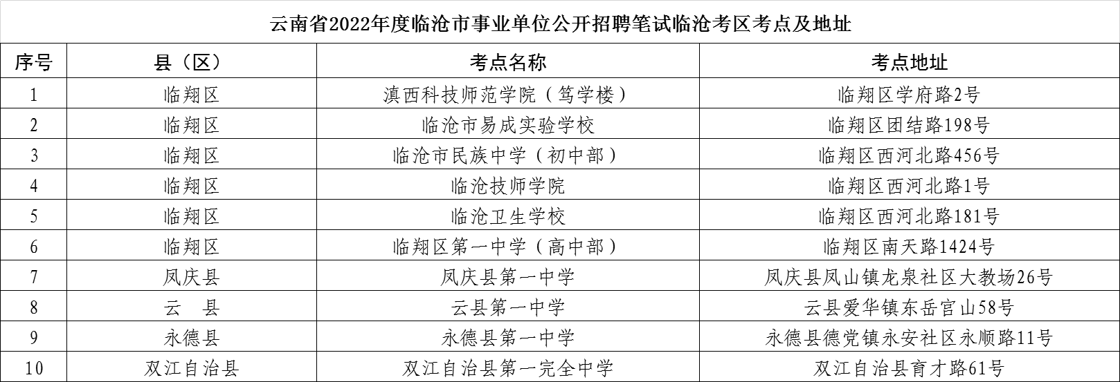 附件1.云南省2022年度臨滄市事業(yè)單位公開招聘筆試臨滄考區(qū)考點及地址