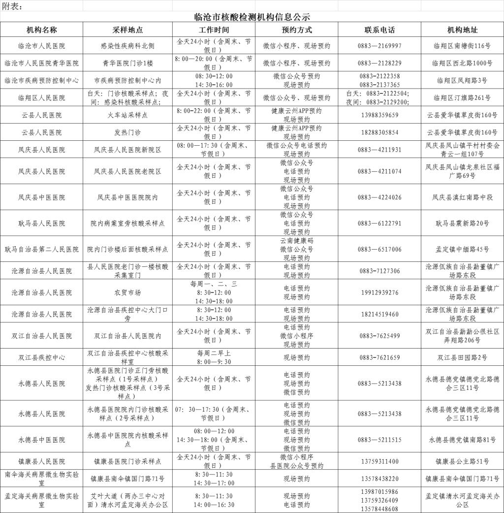 十二、因參考考生人數(shù)眾多,為避免考生考前排長隊做核酸檢測,建議考前居住在臨滄市范圍內(nèi)的考生根據(jù)告知書要求,在所居住地縣(市、區(qū))做核酸檢測(附表:臨滄市核酸檢測機構(gòu)信息公示)。