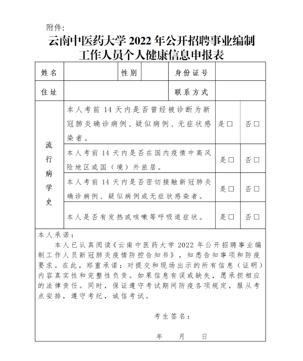 附件:云南中醫(yī)藥大學(xué)2022年公開招聘事業(yè)編制工作人員個人健康信息申報表.docx