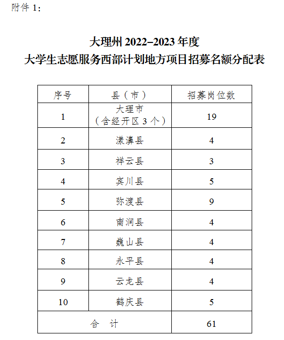 附件:1.大理州2022-2023年度大學生志愿服務(wù)西部計劃地方項目招募名額分配表