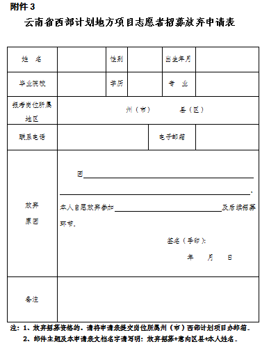 3.云南省西部計劃地方項目志愿者招募放棄申請表(點擊文末“閱讀原文”,輸入密碼ooia下載)