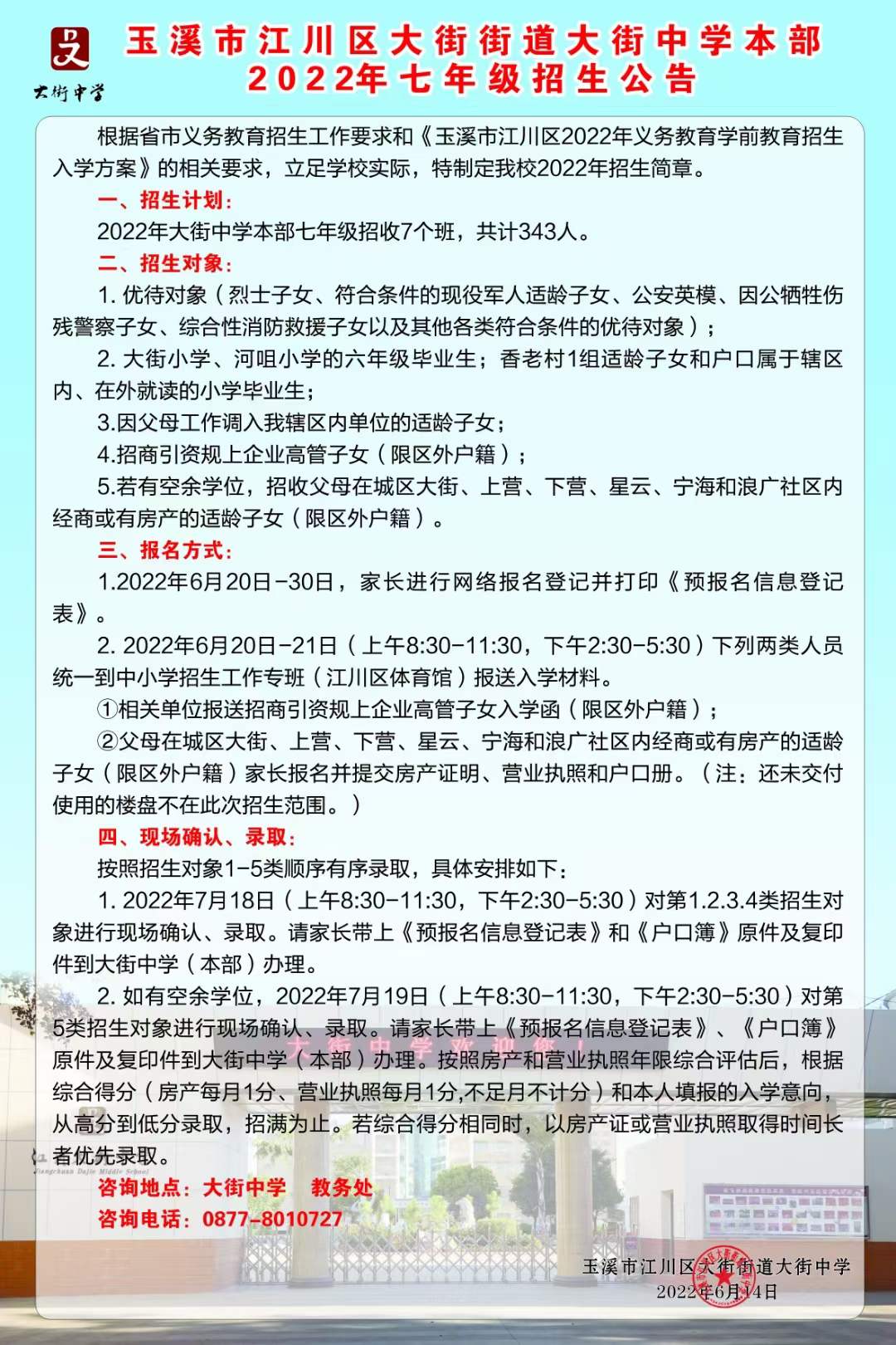 2022年玉溪市江川區(qū)大街中學本部七年級招生公告
