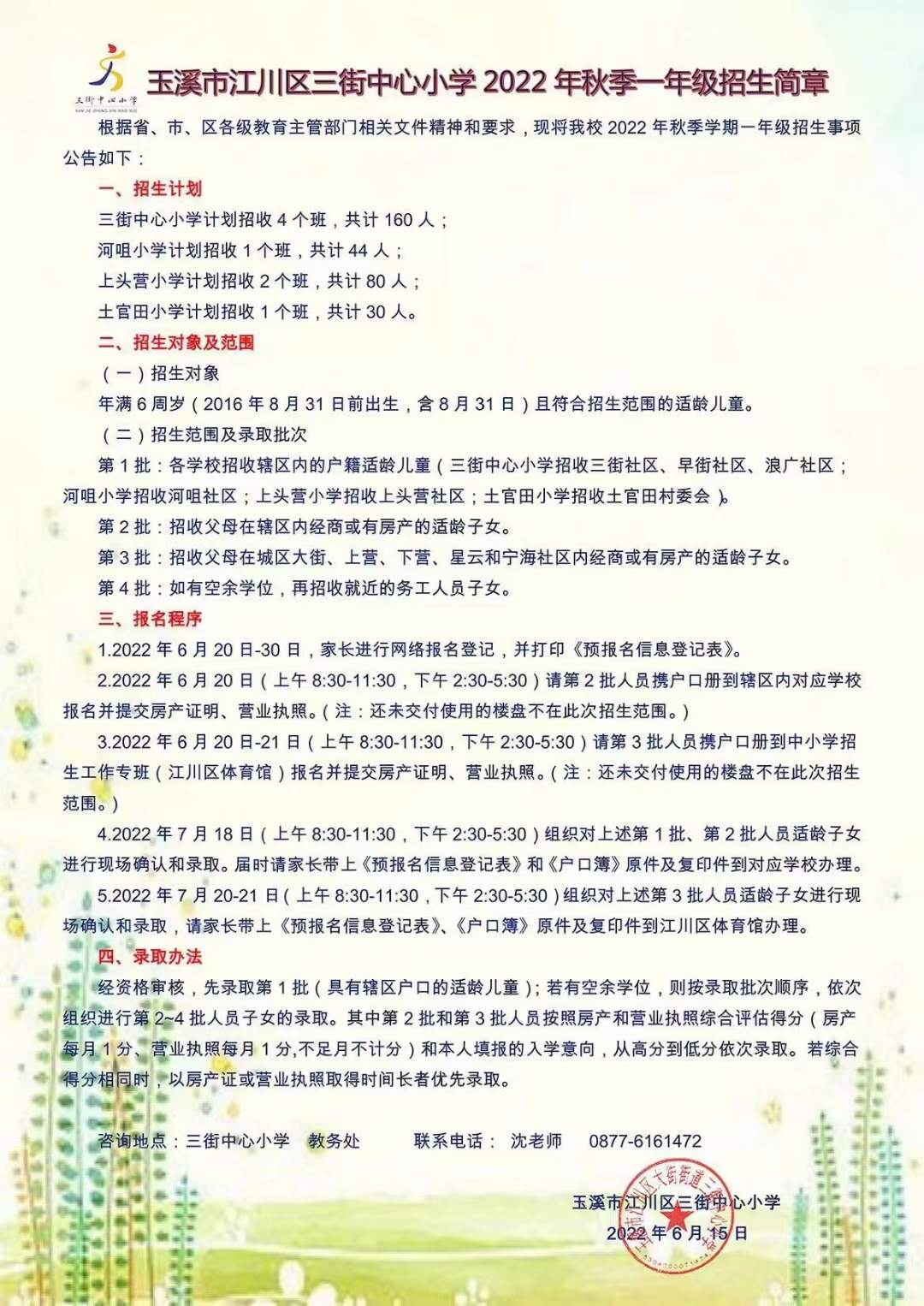 玉溪市江川區(qū)三街中心小學(xué)2022年秋季一年級招生簡章