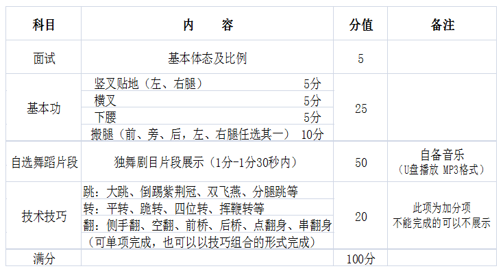 | 備注:關(guān)于比賽及社會(huì)考級(jí)證書的加分說明 (1)各種級(jí)別的比賽(須和藝術(shù)比賽有關(guān))獎(jiǎng)狀,以原件為準(zhǔn),省級(jí)加3分,州級(jí)加2分,縣級(jí)加1分。同一類型比賽,以最高級(jí)別加分為準(zhǔn),不重復(fù)加分。 (2)各種社會(huì)考級(jí)(樂器/聲樂)證書,以證書原件為準(zhǔn),其中8—10級(jí)加5分,5—7級(jí)加4分,3—4級(jí)加3分,1—2級(jí)加2分。所有獎(jiǎng)狀,只選取最高級(jí)別的證書為加分內(nèi)容,不重復(fù)加分。 | ||||