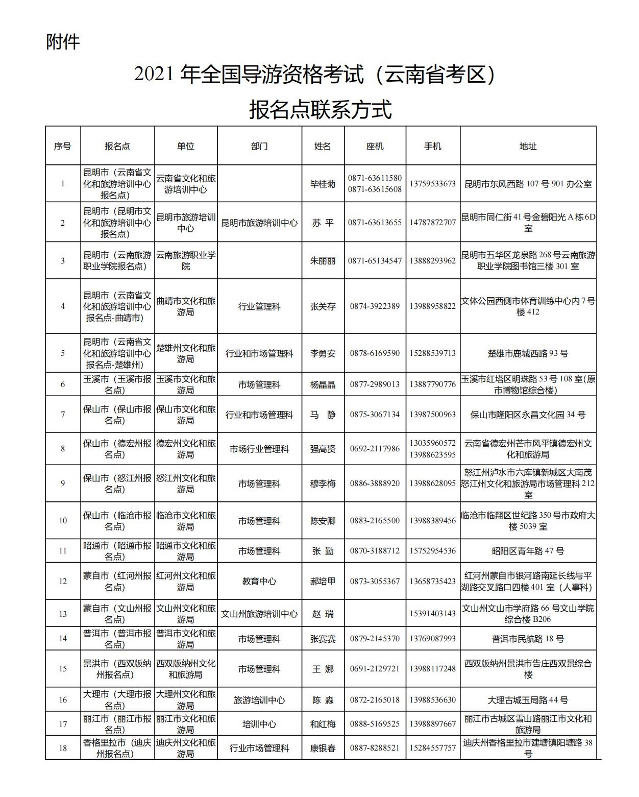 附件:2021年全國(guó)導(dǎo)游資格考試(云南考區(qū))報(bào)名點(diǎn)聯(lián)系方式