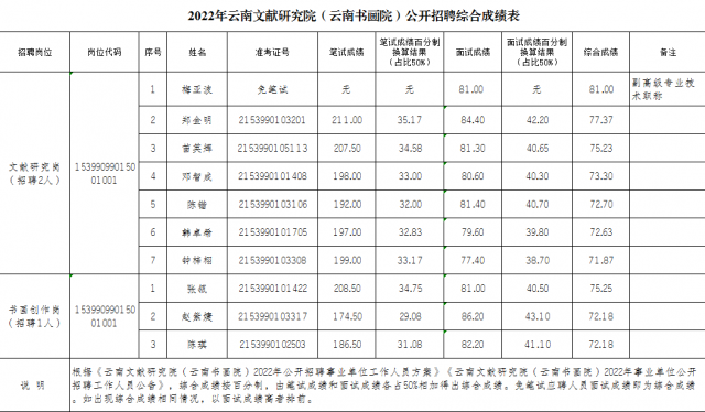 2022年云南文獻(xiàn)研究院(云南書畫院)公開(kāi)招聘綜合成績(jī)表