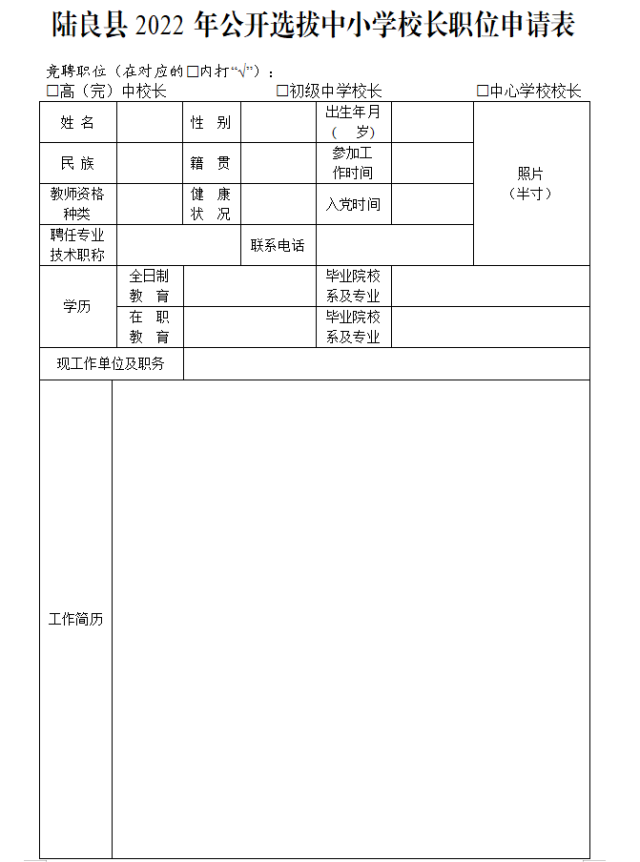 附件:陸良縣2022年公開選拔中小學(xué)校長職位申請(qǐng)表