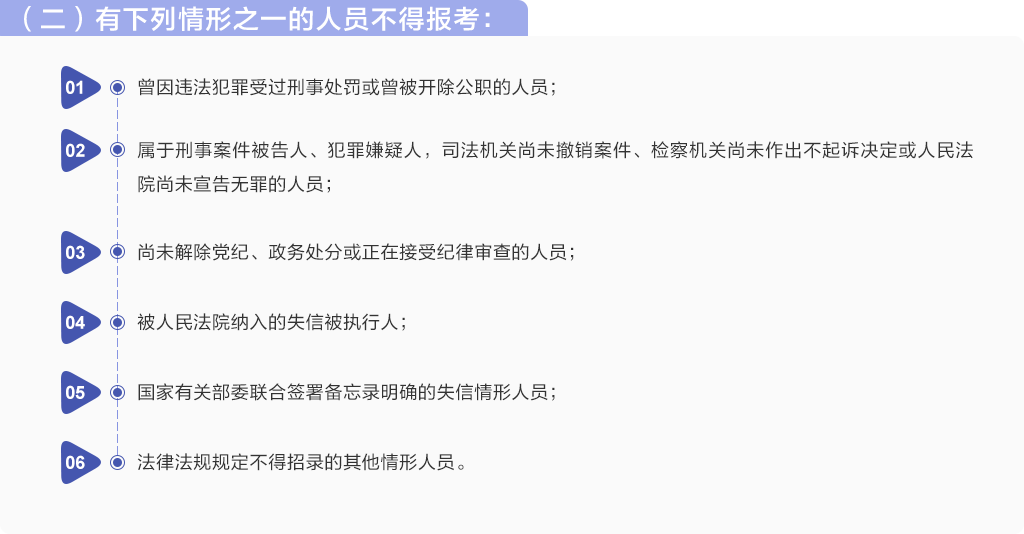 (一)擬錄用人選在筆試、面試、考察、體檢、公示等任意環(huán)節(jié)不滿足條件的,均不予以錄用。