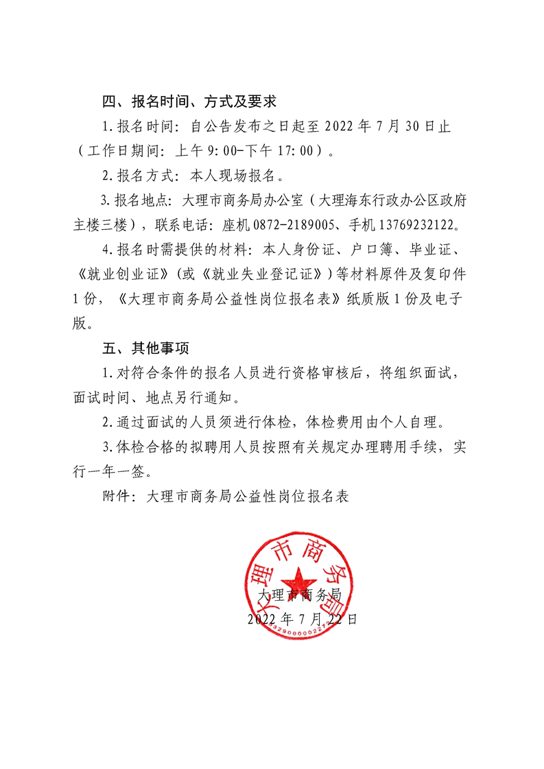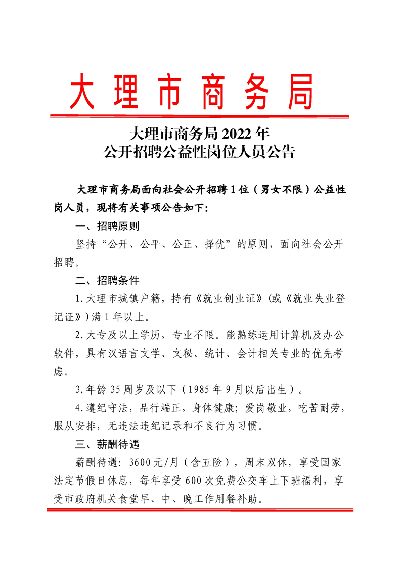 大理市商務(wù)局2022年公開招聘公益性崗位人員公告