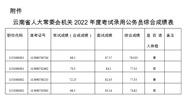 根據(jù)《云南省2022年度考試錄用公務(wù)員公告》安排,筆試、面試工作已經(jīng)結(jié)束,現(xiàn)將報考云南省人大常委會機關(guān)公務(wù)員考生綜合成績及后續(xù)工作安排公告如下。