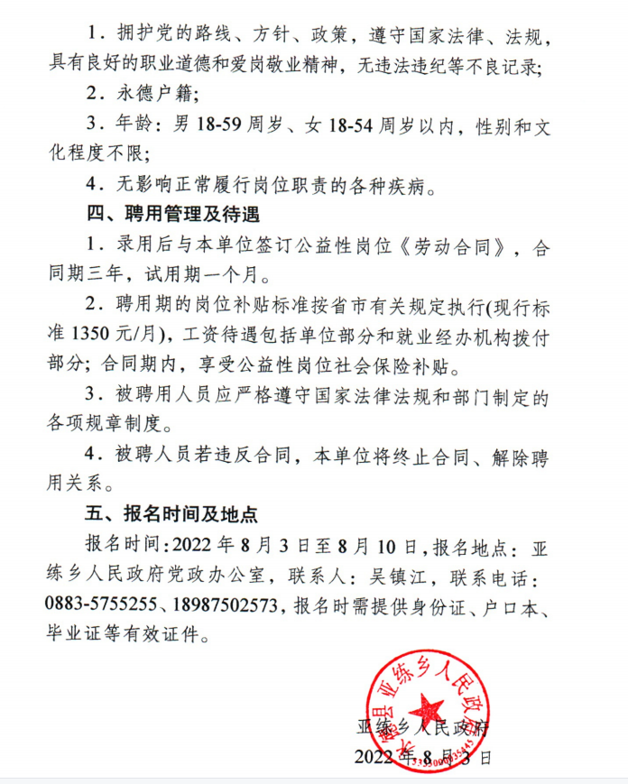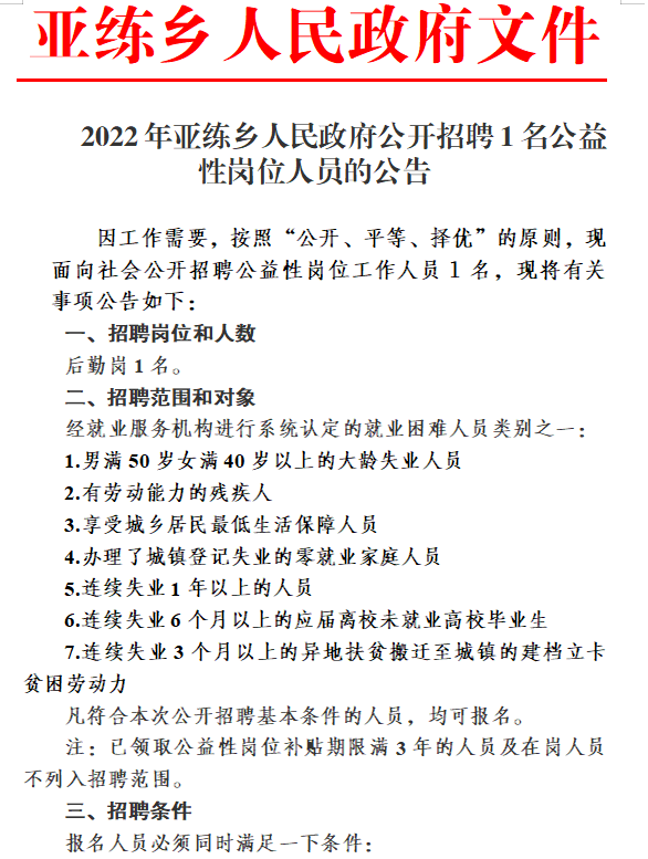 2022年亞練鄉(xiāng)人民政府公開招聘1名公益性崗位人員的公告