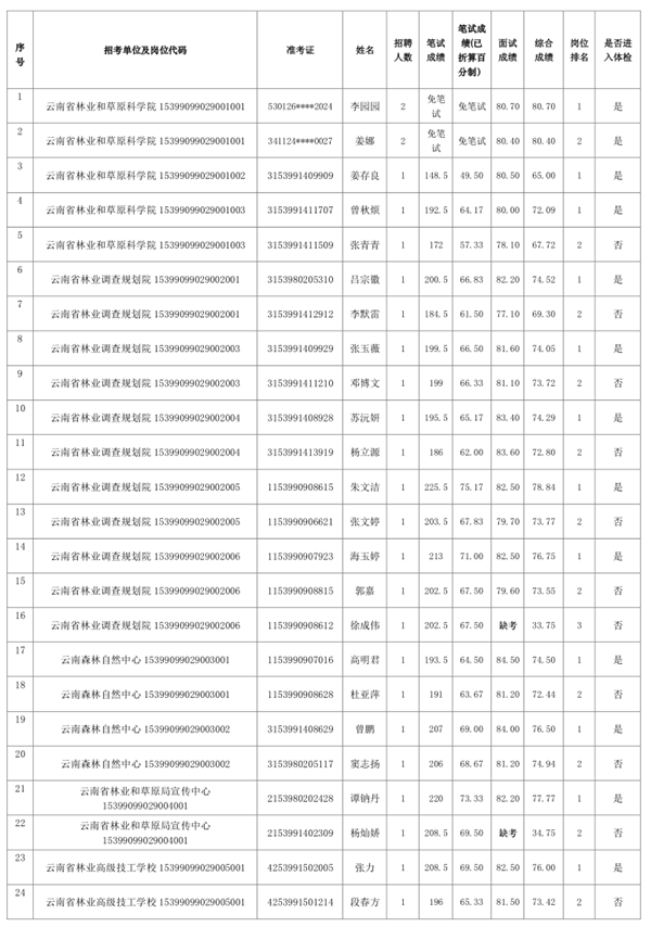 云南省林業(yè)和草原局2022年事業(yè)單位公開招聘工作人員綜合成績和進入體檢人員名單
