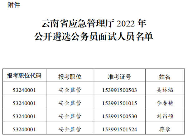 附件:云南省應(yīng)急管理廳2022年度公開(kāi)遴選公務(wù)員進(jìn)入面試人員名單