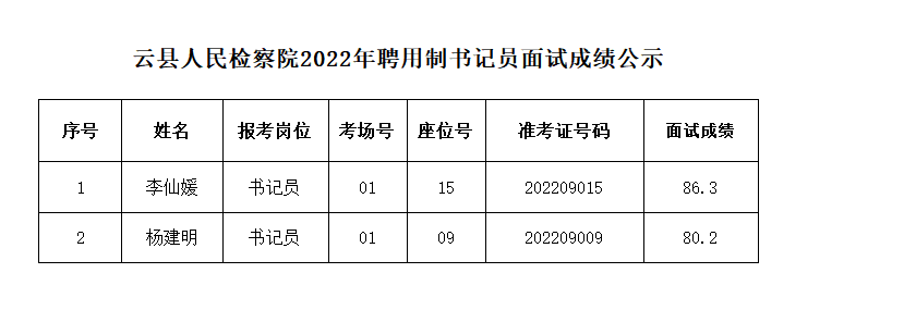 根據(jù)《云縣人民檢察院2022年聘用制書記員招聘公告》、《云縣人民檢察院2022年聘用制書記員考務(wù)工作方案》的相關(guān)要求,通過招聘信息發(fā)布、現(xiàn)場報(bào)名、資格審查、筆試、技能測試、面試等程序,現(xiàn)將3名考試人員技能測試、面試、綜合成績公示如下: