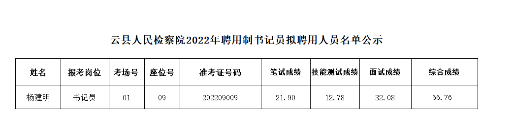 附表:《云縣人民檢察院2022年聘用制書記員擬聘用人員名單公示》
