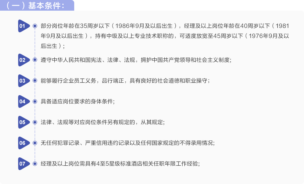 1 | 大學(xué)本科及以上學(xué)歷 | 市場(chǎng)營(yíng)銷(xiāo)、酒店管理等相關(guān)管理專業(yè) | 40周歲以下(1981年7月及以后出生),持有中級(jí)及以上專業(yè)技術(shù)職稱的,可適度放寬至45周歲以下(1976年及以后7月出生) | 1.有3年以上酒店相關(guān)工作經(jīng)驗(yàn),4-5星級(jí)標(biāo)準(zhǔn)酒店相關(guān)工作經(jīng)驗(yàn)優(yōu)先。 2.技能水平:掌握物流管理、財(cái)務(wù)管理、法律等方面的知識(shí);具有較強(qiáng)的領(lǐng)導(dǎo)能力、分析能力、判斷與決策能力、組織協(xié)調(diào)能力、人際能力、溝通能力、影響力、計(jì)劃與執(zhí)行能力。 3.其他要求:原則性強(qiáng),職業(yè)化規(guī)范度高,誠(chéng)實(shí)可靠、品行端正;確認(rèn)在和供應(yīng)商談判時(shí)不接受任何形式的報(bào)酬;具有較強(qiáng)的工作責(zé)任心和學(xué)習(xí)能力、良好的團(tuán)隊(duì)合作意識(shí)。 4.無(wú)任何犯罪記錄、嚴(yán)重信用違約記錄以及任何國(guó)家規(guī)定的不得錄用情況。 4.中共黨員優(yōu)先。 |