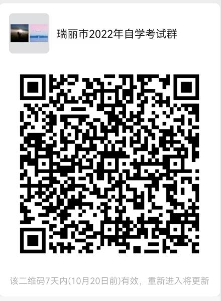1. 瑞麗市2022年自學(xué)考試群二維碼,請(qǐng)參加自學(xué)考試的考生必須于10月15日前掃碼進(jìn)群。