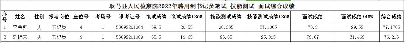 耿馬縣人民檢察院2022年聘用制書(shū)記員綜合成績(jī)公示