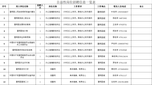招聘具體事宜請咨詢用人單位。符合公益性崗位上崗條件的個(gè)人也可以到嵩明縣勞動就業(yè)服務(wù)局綜合科申請公益性崗位求職登記,詳詢陳老師:0871-67917444。