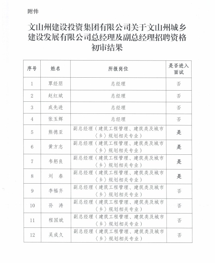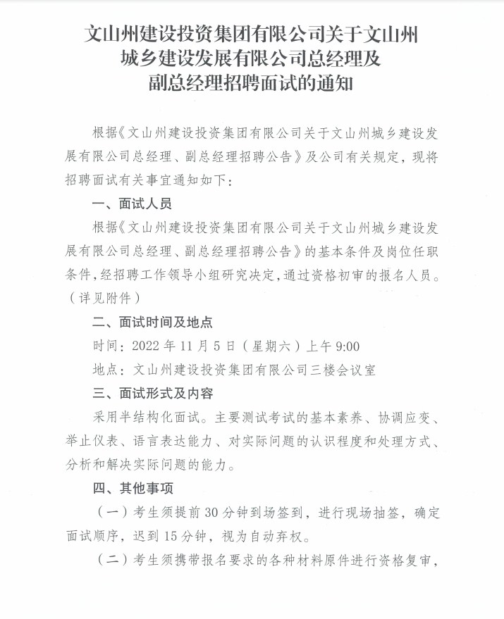 關(guān)于文山州城鄉(xiāng)建設(shè)發(fā)展有限公司總經(jīng)理及副總經(jīng)理招聘面試的通知