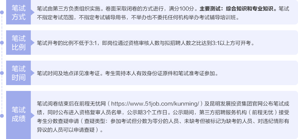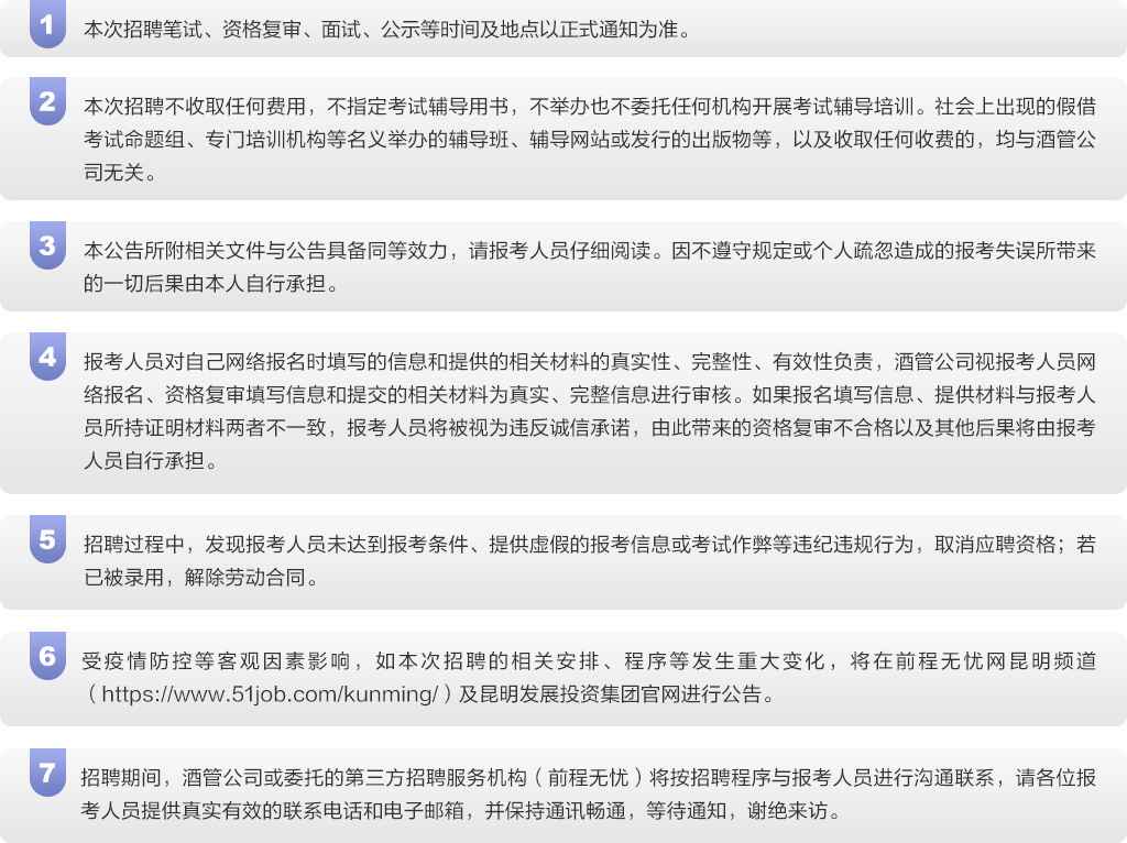 招聘公告及后續(xù)各個環(huán)節(jié)在前程無憂網(wǎng)昆明頻道(https://www.51job.com/kunming/)及昆明發(fā)展投資集團官網(wǎng)公開發(fā)布。報考人員自行登錄前程無憂網(wǎng)昆明頻道(https://www.51job.com/kunming/)或昆明發(fā)展投資集團官網(wǎng)查詢獲取相關(guān)信息,請報考人員關(guān)注前程無憂后續(xù)通知,因查看不及時或因查看轉(zhuǎn)載信息造成的一切后果由考生自行負(fù)責(zé)。