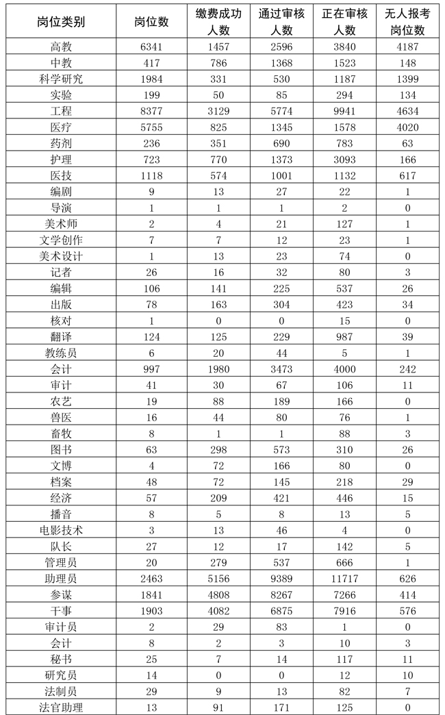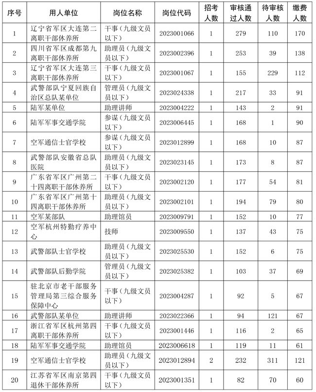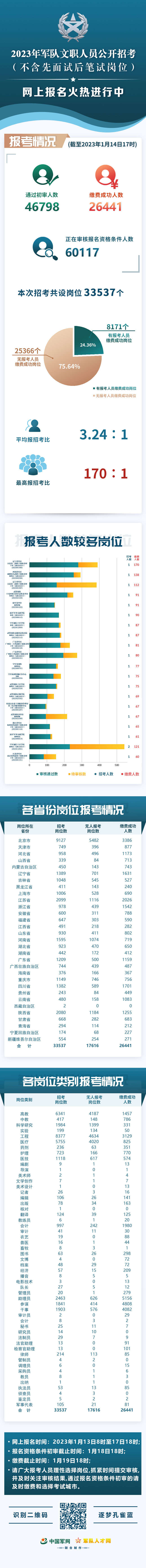 2023年軍隊文職人員公開招考網上報名火熱進行中。截至1月14日17時,通過網上報名資格條件初審的報考人員46798名,繳費成功的報考人員26441名,正在審核報名資格條件的報考人員60117名。有報考人員完成繳費的崗位8171個、占24.36%,平均報招考比為3.24∶1,最高報招考比為170∶1。此次招考網上報名截止時間為1月17日18:00,報名資格條件初審截止時間為1月18日18:00,繳費截止時間為1月19日18:00。請廣大報考人員理性選擇崗位,抓緊時間提交審核,并及時關注審核結果,通過報名資格條件初審的請及時繳費和選擇考試城市。相關招考崗位報考情況如下: