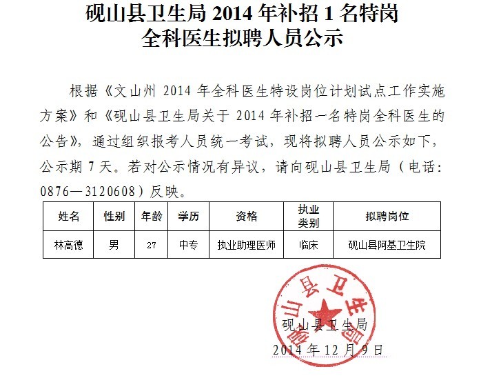 文山州硯山縣衛(wèi)生局2014年補(bǔ)招1名特崗全科醫(yī)生擬聘人員公示