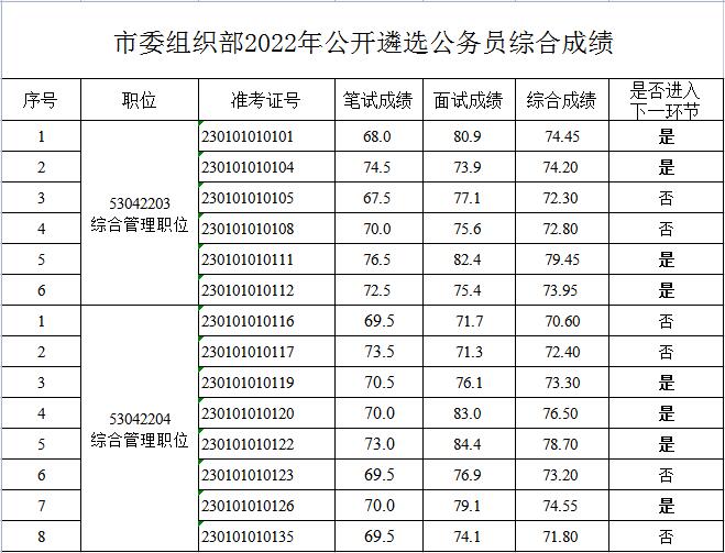 市委組織部2022年公開遴選公務(wù)員綜合成績