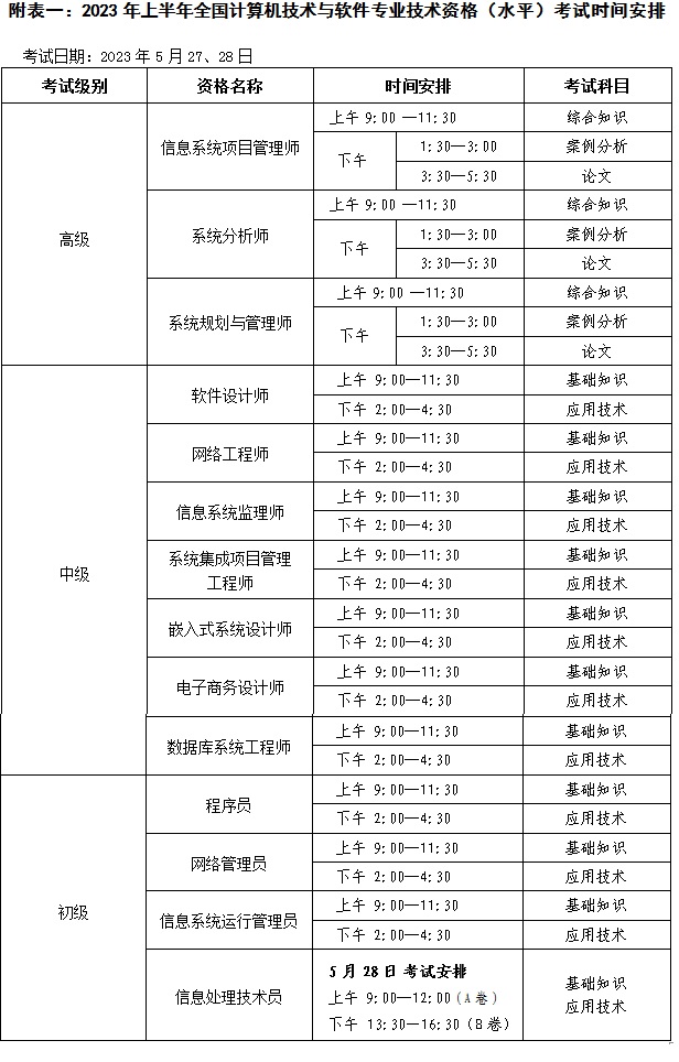 一、《2023年上半年全國(guó)計(jì)算機(jī)技術(shù)與軟件專業(yè)技術(shù)資格(水平)考試時(shí)間安排》