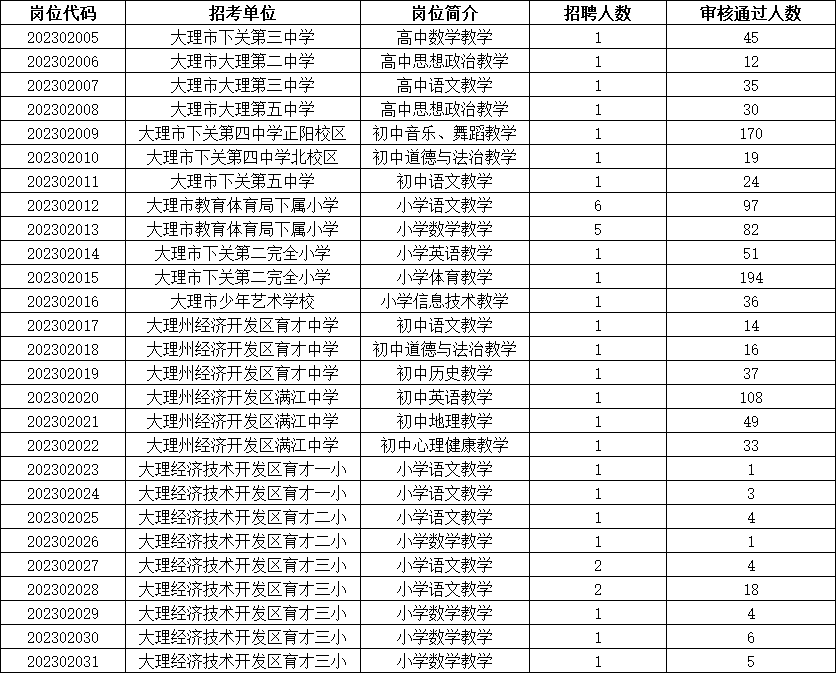 按照《大理州2023年事業(yè)單位考核招聘工作人員公告》相關(guān)要求,本次考核招聘大理市教育體育局下屬學(xué)校共設(shè)置27個(gè)崗位,招聘38人?,F(xiàn)將資格審查結(jié)果和筆試、面試有關(guān)工作情況公告如下: