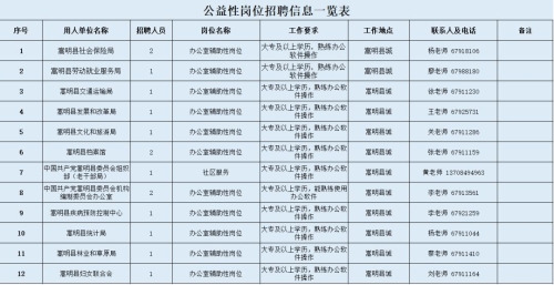 招聘具體事宜請咨詢用人單位。符合公益性崗位上崗條件的個人也可以到嵩明縣勞動就業(yè)服務(wù)局綜合科申請公益性崗位求職登記,詳詢陳老師:0871-67917444。
