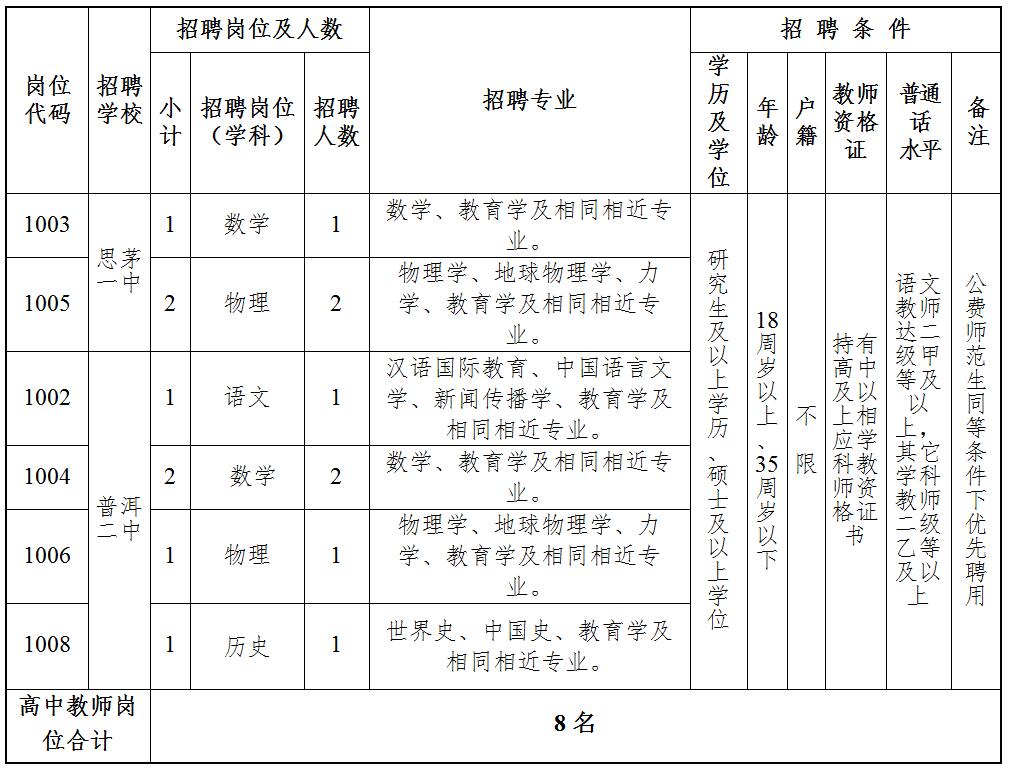| 1 | 1003 | 普洱市思茅區(qū)教育體育局 | 思茅一中 | 全額撥款 | 數(shù)學 | 數(shù)學、教育學及相同相近專業(yè)。 | 研究生及以上學歷、碩士及以上學位 | 1.持有高中及以上相應學科教師資格證書; 2.語文教師普通話等級水平達二級甲等及以上,其他教師普通話等級水平達二級乙等及以上。 | 1 |